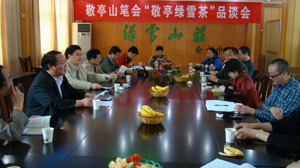 参加这次笔会采风活动的著名作家有:安徽商报常务副总编辑赵焰,省作协常务副主席许辉,安徽日报原编委、省报纸副刊研究会会长、省记协常务理事周根苗,省作协副主席李平易,中国科技大学人文学院教授、博导徐飞,宣城市委外宣办主任、市政府新闻办主任徐艾平等一行17人。作家们兴致盎然地参观了敬亭绿雪公司制茶车间和绿雪茶园基地,并在绿雪山庄品茗畅谈。