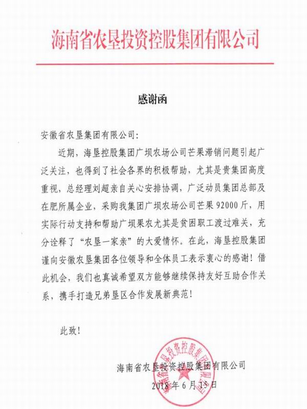 今年海南农垦水果大丰收,但近期销售难、卖价低、果农愁,尤其是广坝农场公司芒果滞销严重。海垦集团发来求助信息,安徽农垦集团高度重视,总经理刘超亲自安排协调,由皖垦农产品超市牵头助销,制定工作方案,广泛动员集团总部及在肥所属企业,联系“五星”等水果经销商,仅一周时间就销售“爱心芒果”9.2万斤,倾情支持和帮助广坝果农尤其是贫困职工渡过难关,充分诠释了“农垦一家亲”的大爱情怀。
