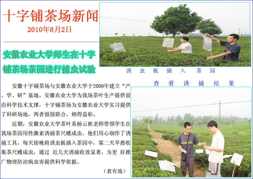 安徽农业大学师生在十字铺茶场茶园进行捕虫试验