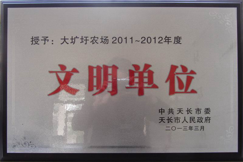 近年来,大圹圩农场文明创建工作坚持以科学发展观为指导,围绕中心促发展,注重民生促和谐,扎实推进,稳步发展,态势良好,被天长市委市政府授予“2011—2012年度文明单位”称号。4月7日下午,市委宣传部及文明委为农场授牌。(郑运章)