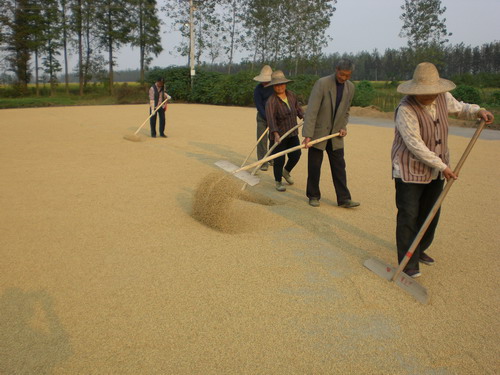 早在10月14日,农业第三管理区原七分场就陆续有几户开镰收割,针对受台风影响水稻倒伏面积较大的实际情况,他们灵活采取雇佣农村小型机械直收脱粒和人工、机械割晒相结合的方式,适时抢收。现晒场上已铺满了黄灿灿的新谷,家庭农场职工正积极利用晴好天气,互帮互助,加紧粮食翻晒。田间地头也随处可见忙碌的身影,还有的职工自己动手割晒倒伏的水稻,积极为尽早收割做准备。