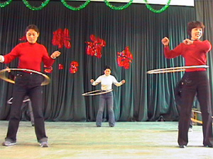 表彰大会结束后,女工们进行了卡拉OK演唱和趣味 体育竞赛文体联谊活动,全场有13个女工组织、近 100名女工参加了歌曲演唱和趣味游戏项目角逐。 联 谊活动别开生面,唱歌、游戏、趣味体育竞赛交叉 进行,新颖活泼,妙趣横生,吸引了数百人前来观 看,大会堂内歌声、笑声、掌声,此起彼伏,热闹 非常。庆祝活动持续近4个小时,收到了较好的效 果。(图为联谊活动中女工们进行转呼啦圈竞赛)